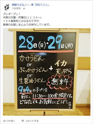 2016-08-28 プレオープン!「河田うどん」 ◇うどん情報♪ ◇「河田うどん」一般店◇ お店facebook 住所:岡山市北区表町1-3-46 電話:086-222-4540「河田うどん」の過去ブログ 「新店情報!」