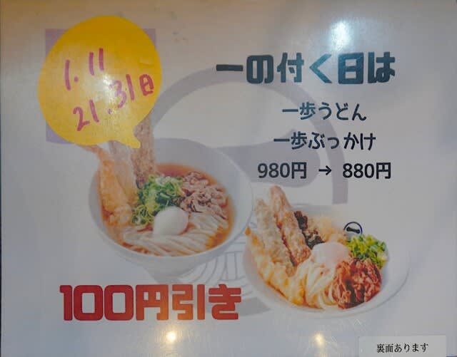 席に座ると一の付く日だったので一歩うどんが100円引き。